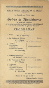 chemin avec une chanson. Partie II. Ed. « Tair », Paris, 1930. 116 pp., in-8, reliure de l’éditeur (détachée), en l’état. 3) Jeune femme. Dessin au stylo et aquarelle. Monogrammé « MK » et dédicacé par N. Plevitskaya, 26 х 17,5 cm. 4) Affiche d’une soirée caritative avec un concert de N. Plevitskaya. 22 février 1930. ПЛЕВИЦКАЯ Надежда (1884-1940) – Автограф ЛОТ: 1) Дежкин карагод. Вступление А. Ремизова. В 2 частях. Ч. 1. В Тип. Бр. Гиршбаум, Берлин, 1925. 103 стр., 25 х 19,5 см., владельческий переплет (без изд.обл.), дарственная подпись на авантитуле (имя заклеено), в сост. 2) Мой путь с песней. Часть 2. Продолжение «Дежкин карагод». Изд. «Таир», Париж, 1930. 116 стр., 26,5 х 20 см., изд.обл. (отделена по корешку), в сост. 3) Девушка. Рисунок. Бумага, акварель, ручка. Монограмма «МК», дарственная подпись Н. Плевицкой. 26 х 17,5 см. 4) Анонс благотворительного вечера с выступлением Н. Плевицкой. 22 февраля 1930 г.