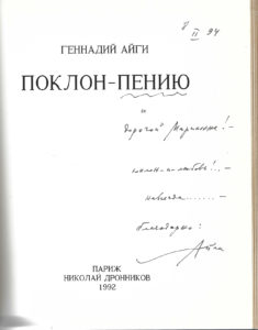 AÏGUI Gennady – Autographe DRONNIKOV Nicolas – Autographe LOT de deux livres de la poésie de Gennady Aïgui : 1) Un salut au chant. Ed. N. Dronnikov, Paris, 1992. 91 pp., ex. № 419 (tirage 500 ex.), in-8, reliure de l’éditeur, dédicacé...