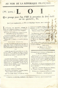 nationaux.Frimaire-fructidor an VII : paiement des acquisitions de Biens nationaux, l’Enregistrement, biens indivis, contributions, adjudication des Biens nationaux aux communes, hypothèques, taxe sur les portes et fenêtres, créances, secours provisoires, Dette publique, traitement des fonctionnaires, dispense de patente pour les manufacturiers, partages, subvention de guerre, droit de timbre, répression du brigandage et des assassinats, adresse du Corps législatif sur la situation intérieure et extérieure de la France, danger des dissensions civiles, serment civique, créanciers de la République, justice de paix, réduction des traitements payés par le Trésor public, droit sur les spectacles, etc.13 ventôse IX : listes d’éligibilité. 12 floréal XII : bois nationaux.