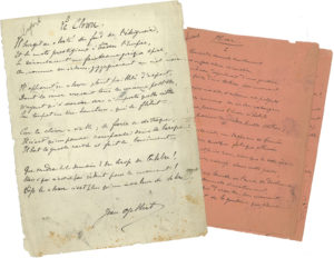 sonnet : « Il surgit en clarté du fond de l’éteignoir »… (1 p. in-4). « On dit : “ça calme les nerfs, la grrande nature” »…, 4 sizains (1 p. in-fol., fentes et rouss.).On joint 2 L.A.S. d’envoi à Georges Lecomte, directeur de la Cravache, 1888.