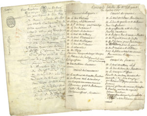 Cabinet d’Hozier). – 1693. Quittance de François de la Chapellerie, écuyer du seigneur De Breuil de Pouilly. – 1786. Acte de vente à Fontenay le Comte, avec document liassé.Manuscrit sur papier : « Conseils establis par Mr le Régent en Septbre 1715 ».On joint une image-souvenir en soie brodée, 1875 (24,5 x 13 cm) aux armoiries de la ville de Saint-Étienne, surmontées d’un phylactère portant : « 1re Session provinciale Congrès des Orientalistes St Étienne 12-25 8bre 1875 ».