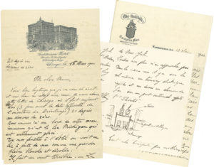 fille Léontine sur l’incendie du Bazar de la Charité.1899-1900, longues lettres de son fils Antoine (1870-1906 ?) et de sa femme Louise, de New York, décrivant les gratte-ciels et les trains sur les ponts métalliques (croquis) ; Washington, sur les exploits de l’amiral Dewey, et relation d’une réception à la Maison Blanche par le président Mac Kinley ; Chicago, avec le lac Michigan et sa population grouillante…On joint :2 fascicules des allocutions prononcées à Poitiers, pour les mariages de Auguste Véron et Léonine Aubaret et celui du comte Antoine Aubaret et de Louise Siry. Poitiers 1891 et Paris 1898 ; morceau exécuté au mariage de Cécile Aubaret avec le comte du Pavillon (1899) ; notice ms sur l’amiral Auguste-Joseph Veron.