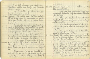 Montluçon, Compiègne, Avignon, Vierzon, Saint-Priest, Tours, Savonnières, Limoges, Angoulême, Saint-Jean d’Angély, Saintes, Cognac, Bagnères de Bigorre, Lourdes, Varenne sur Allier. Ce cahier, suite d’un n° 1 manquant, va du 24 mars au 23 août 1940. Nous en donnerons de brefs extraits.11 avril. « Le capitaine et 3 hommes d’équipage allant convoyer un Bloch 210 se sont carbonisés dans un atterrissage forcé après le décollage ». 14 avril. « Pendant ma permission la plupart des avions Bloch sont partis. Des Potez 633 sont venus compléter la formation car les Bréguets se démolissent assez facilement… le Bréguet est assez bien armé mais le Potez ne l’est guère ». 11 mai. Bombardement : « nous entendimes des sifflements dont le bruit nous remplit d’horreur et presque aussitôt le bruit des bombes explosant. Tout tremblait dans un vacarme épouvantable. Je m’étais jeté dans le couloir et m’étais couché, je me relevai aussitôt après l’éclatement pour gagner l’extérieur, mais de nouveaux sifflements me firent me jeter sous les lavabos et pendant quelques secondes ce fut un tonnerre indescriptible. Parmi la poussière, les débris, des hommes jonches le sol. Je passai les premiers abris avec tant d’autres fuyant et couru m’abriter sous une haie d’arbres à 500 m de la caserne en passant à travers champs, marécage ou j’avais de l’eau et de la boue jusqu’au ventre »… 14 juin. Exode… Etc.