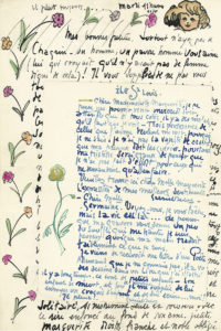 Le peintre-poète s’adresse à ses « chères petites », Marguerite Steinlen (nièce du peintre) et sa compagne Germaine Perrin (qui deviendra la 3e femme du compositeur et chef d’orchestre D.E. Inghelbrecht).Samedi. Il les remercie de leur lettre quoique Marguerite lui donne du « mossieu », et que Germaine montre une certaine distance « qui calme les battements de mon cœur, si bien que je me retrouve grelottant. Excusez ma franchise, elle vient d’un être qui ne demande qu’à aimer. […] se fermer c’est tuer dans l’œuf les gestes de fraternité ». – Mardi. Longue lettre illustrée d’une tête d’enfant et de fleurs colorées dans les marges : « Ce n’est pas rien de nous être rencontrés ! Un homme roué de coups par le destin rencontrant deux êtres charmants bons et nobles ! Un homme qui vous crie dans son amour : croyez au bonheur, il existe si nous le voulons ». Il s’adresse aux deux jeunes filles, dont il fait un touchant portrait : « Petite Germaine expressive et rieuse et généreuse obligée toute jeune de vivre solitaire, sinistrement seule et austère avec le rire enfoncé au fond de son âme. Petite Marguerite droite, franche et noble obligée de cacher la noblesse de son moi pour ne pas être traitée de pimbêche ou autre qualificatif aussi harmonieux que ridicule ». Il compte venir les voir et leur lire La Légende de St Julien l’Hospitalier de Flaubert « à haute et distincte voix. Riez, mais riez donc, mes chéries. C’est en cela que vous êtes jeunes et qu’un pauvre homme vous demande l’aumone d’un sourire et l’autorisation de regarder vos yeux pleins d’une rosée de larmes donnée par le rythme de trois âmes qui se sont retrouvées… Ouf ! Ce que l’on en a du mal pour distraire les petites filles quand on les a chagrinées »... – 12 décembre 1920, il dessine des colombes et des arbres battus par la pluie : « La Nature n’est tout comme les hommes dont elle fait corps, ni bonne ni mauvaise »... – Ile St Louis, avec dessin de fleur : « de penser que ma gravure vous donne un peu du souffle qui me hante, je suis heureux quoique ma main traduit faiblement ce que je sens »… – Vendredi matin 7h. Il est rentré de bon matin : « Le calme et la douceur de vivre descendait du ciel…Dans l’Ile St Louis ? Les arbres se caressaient en écoutant le rythme de l’eau […] Allons encore merci mes chères et délicates amies : je suis si peu habitué aux gestes tendres que lorsqu’il m’arrive de rencontrer ces fleurs rares, je me retrouve ivre comme un cosaque ! ». Il conclut sa lettre par un joli dessin de maternité. – 20 décembre 1920, sous forme de poème en prose intitulé Un ami : « Je pense à un ami. Son âme aussitôt marche devant moi… Ses yeux fixent mes yeux et son cœur bat dans mon cœur. […] Je pense à un ami : Le ciel devient plus lumineux. – Sa parole ? Je l’entends dans le murmure d’un feuillage et dans le son harmonieux du vent »…On joint environ 120 L.A.S. de Germaine INGHELBRECHT née PERRIN (1892- ?, troisième femme du chef d’orchestre D.-E Inghelbrecht), [1922-1932], à Colette Steinlen ; environ 250 pages formats divers. Abondante correspondance entre les deux grandes amies, principalement relative à leur vie quotidienne, leurs amitiés, leurs amours, Inghelbrecht, Désormière, le peintre Théophile-Alexandre Steinlen, sa relation tendre avec Marguerite Steinlen, etc. Plus la correspondance croisée entre Germaine Perrin, et son père R. Perrin à Lausanne, 1927-1928.