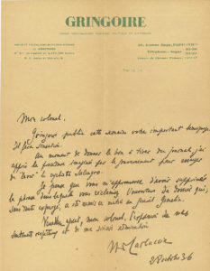 Gringoire va publier le témoignage du colonel Hepp : « Il fera sensation. Au moment de donner le bon à tirer du journal, j’ai appris la procédure imaginée par le gouvernement pour essayer de “laver” le cycliste Salengro. Je pense que vous m’approuverez d’avoir supprimé la phrase dans laquelle vous réclamiez l’ouverture du dossier qui, sans doute expurgé, a été remis ce matin au Général Gamelin »… [Roger Salengro (1890-1936), accusé de désertion, se suicidera dans la nuit du 17 novembre.]