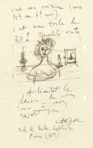 figurer sans compter que j’ai quelques retouches à y faire. […] C’est une toile de 20 P tonalité verte » ; et il dessine le tableau, représentant un buste de femme dénudé avec en arrière-plan une fenêtre ouverte.On joint deux cartes postales a.s. (1990) reproduisant ses œuvres ; et une page (21 x 15,5 cm) où, autour d’une photographie de Vierge à l’enfant, Carzou a dessiné un encadrement de feuillages et de masques (signé et daté 1990).