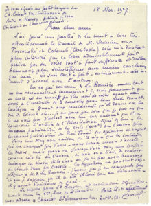 sujet de Christophe Colomb. Il a lu le « travail de M. Sumien sur Toscanelli et Colomb (Christophe) » et est arrivé aux mêmes conclusions que lui. Quant à la « carte de Christophe Colomb » découverte et publiée par Charles de La Roncière : « Je crois fermement que sa carte est ou aurait pu être une de celles ayant servi à l’escadrille de 3 caravelles pour leur raid transatlantique. Quant aux considérants qu’il donne sur la vie de Colomb etc… je ne peux pas dire que je suis ou que je ne suis pas d’accord avec lui car suivant que l’on considère l’article de l’Illustration signé de lui – la luxueuse publication de la carte (600 f) ou l’encore plus luxueuse publication du Roi Fouad ses opinions changent. […] Quand on change d’avis dans une question comme celle-là, on l’avoue, si non on a l’air de vouloir ménager la chèvre et le chou ou de ne pas avoir beaucoup de plomb dans la cervelle. […] Je suppose qu’il a été ébloui par sa découverte – il y avait d’ailleurs de quoi »… Il recommande le livre d’André de Hévesy sur Christophe Colomb.