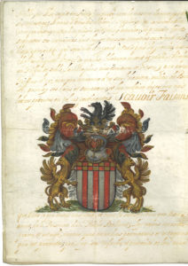 des privilèges de la famille Peellaert en Flandre, pour Pierre Peellaert qui s’est comporté en homme d’honneur et battu courageusement contre les Français au siège de Saint-Omer et à l’attaque du fort de Bacque. Ses armes sont « d’argent à trois pals de gueules, au chef eschiquetté d’or et de gueules, l’heaume ouvert et grillé, chimier au griffon de sable, lambrequins aux esmaux de l’escu, par deux griffons d’or, avec une couronne d’or sur l’heaume »… Document enregistré à Bruxelles à la Chambre héraldique, et signé par Joseph Vanden Teene et par le Roy et Héraut d’armes Charles Falentin dit Flandres.