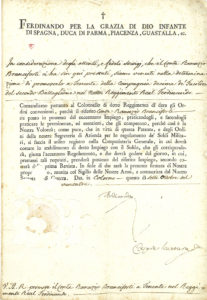 Branciforti au grade de lieutenant dans la 10e compagnie de fusiliers du 2e bataillon du « Reggimento Real Ferdinando ».On joint 3 pièces avec griffes des Rois d’Espagne Charles III (1772), Charles IV (1807) et Ferdinand VII (1825).