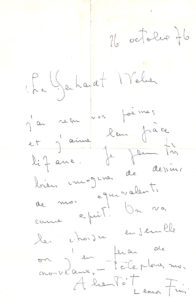 Leonor FINI (1908-1996). 2 L.A.S., 26 octobre 1976 et s.d., à Gerhard Weber ; 2 pages in-4 (trous de classeur).{CR}Elle a reçu ses poèmes et aime leur « grâce bizarre. Je peux très bien imaginer de dessins de moi équivalents comme esprit....