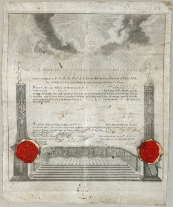 Parfaite Franchise à l’Orient de Paris à Charles La Pierre. Parmi la vingtaine de signataires, on relève le 1er président Picard, et les secrétaires Jean-Baptiste Michonis (1735-1794, mêlé à la conspiration de l’œillet pour sauver Marie-Antoinette) et Godard.On joint un autre brevet au nom de Julien Marie Lapierre (19 avril 1792) ; et 2 invitations encadrées (sous verre) à des fêtes : 20 germinal IX au Cirque « en réjouissance du Retour de la Paix » ; bal des Menuisiers du Devoir à Nantes (1841).