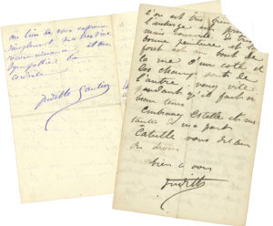 Judith GAUTIER (1850-1917). 2 L. A. S. (la 1ère « Judith ») ; 4 pages in-8 chaque (un coin coupé à la 1ère).{CR}[Vers 1866-1867], à son ami l’architecte Charles Robelin, que Judith (jeune épouse de Catulle Mendès) invite à les...