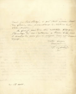 « Vous pouvez juger mieux que personne, Monsieur, du prix que je dois attacher à votre suffrage, auquel le talent, le goût le plus exercé et le plus pur donnent tant de prix. Je m’estimerais heureux d’être à même de profiter de vos utiles critiques. J’ai besoin de croire que j’irai un jour revoir notre chère Italie. C’est un désir et un espoir que je ne saurais abandonner. Malheureusement je ne vois encore que de loin le moment où je pourrai jouir des Arts dans cette terre promise, au milieu d’une société qui sait si bien les sentir. Il m’est impossible de juger quand les travaux dont je suis chargé, et qui sont à peine sortis du germe, me permettront de réaliser de si chers projets. Ce que je puis dire avec certitude c’est que l’avantage de vous retrouver à Rome n’est pas le moindre de ceux que je me propose dans cet heureux voyage »…