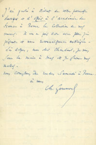 nous ne dégringolons pas au fond des précipices ». Il prie d’envoyer à la sœur Saint-Paul du couvent de Sainte-Ursule à Grenoble, qui s’avère être une excellente musicienne, un exemplaire des parties piano, orgue et chant du Cantique après la Communion dès qu’il aura paru. Il a parlé à Hébert « de votre promesse d’envoyer et d’offrir à l’Académie de France à Rome la collection de mes œuvres. Il en a pris acte avec une joie présente et une reconnaissance anticipée ». Il compte être à Rome samedi.On joint une L.A.S. d’Alfred Cortot, 5 mars 1915 ; et une lettre en fac-similé de Boieldieu.