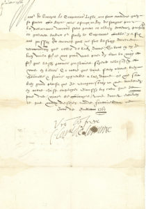 Limoges, ambassadeur en Espagne ; ¾ page in-fol., adresse.{CR}Demande de Catherine de Medicis de libérer des prisonniers sur les galères espagnoles. « Le Cappitaine Lisle ma faict entendre quen sa faveur la Royne mere escript au Roy d’Espaigne pour la delivrance daucuns siens parens et alliez detenuz prisonniers es galleres dudict sr soubz le Cappitaine Labbe y a six ans passez. Et encores quil ne soit besoing dautre recommandacion que celle de ladicte Dame, si vous en ay je bien voulu fere ce mot pour vous prier dy tenir la main et fere que lesdicts pauvres prisonniers soyent relaschez et mis en liberté »…