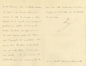 souvent entendu vanter les éminentes qualités de son aide-de-camp de Beurnonville ». Il honore à son tour « la mémoire du vieux serviteur de la monarchie par un témoignage de sympathie et de reconnaissance. Le Colonel du 6ème régiment de la garde royale a été dans sa vie militaire le modèle du dévouement et de l’honneur. Dans sa retraite volontaire, et jusqu’à sa dernière heure, il a conservé le culte des principes en dehors desquels il ne voyait pour son pays ni grandeur, ni salut. S’il a eu la douleur de briser son épée, il a su du moins servir encore la France par l’exemple de sa fidélité ». Le baron et son frère peuvent être « fiers du nom que vous portez »…On joint une copie d’époque de la proclamation du comte aux Français, le 25 octobre 1852.