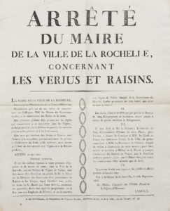 étalages de marchandises (1837).Lettre circulaire de l’évêque de La Rochelle, à MM. les Curés du Diocèse [1830].On joint 2 affiches d’arrêtés du Maire de Rochefort sur l’échenillage des arbres, haies et buissons (1842, 1847), et une affiche sur papier violet pour la Broie mécanique rurale (Angoulême 1826).