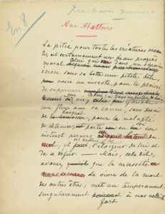 Hugues LE ROUX (1860-1925). Manuscrit autographe signé, Aux abattoirs ; 13 pages et quart in-4, avec corrections à l’encre rouge.{CR}Saignant reportage sur l’œuvre des « tueurs » des abattoirs de la Ville de Paris, leurs méthodes, avec...