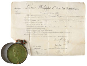 LOUIS-PHILIPPE. P.S., Palais de St Cloud 25 septembre 1846 ; contresigné (2 fois) par le Garde des Sceaux H. Martin du Nord ; vélin in-plano en partie impr., grand sceau de cire verte pendant sur rubans rouge et vert à l’effigie royale dans...