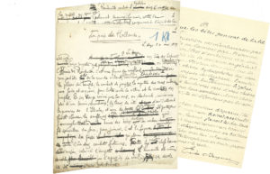 d’Agen (sur un sonnet attribué à Molière, plus 2 l.a.s. à Léon Deffoux), Pierre Daninos (tapuscrit avec corrections autogr.), François Erval (compte rendu du De Gaulle d’Alexander Werth), Louis Fuzelier (2 poèmes : La Rejouissance des habitans de la Celle a l’arrivée du Roy dans leur village et Au Merlan), Paul Guth (Le baccalauréat d’octobre, et 3 l.a.s.), Henry Monnier (2 brouillons de poème au crayon), Jean Rameau (poème L’Acacia), Henri Rochefort (article sur la divulgation du plan de mobilisation, 1887 ; photo jointe), Henri Troyat (article sur le tourisme), Roger Vailland (3p. de notes sur la philosophie).