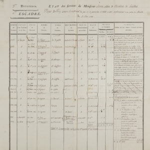 Sanilhac (Montpellier 1748-1827). [Massilian de Sanilhac commença à servir dans la marine en qualité de volontaire en 1765. Il fut reçu garde de la marine le 12 janvier 1766, enseigne de vaisseau (1773) et lieutenant de vaisseau (1779). Chevalier de l’ordre de Saint-Louis en 1780 « en récompense d’une blessure reçue au combat livré devant la Grenade », il est ensuite promu major de vaisseau (1786) et enfin capitaine de vaisseau en 1814. Il a servi dans des bâtiments sous le commandement de Forbin d’Oppede, Castellane-Majastre, et surtout, dans plusieurs campagnes, sous Suffren, notamment en 1778-1779 lors des guerres d’Indépendance américaine. Il participa également à des campagnes en Méditerranée, à la guerre de Tunis (1770), dans le Levant, à Newport contre l’amiral Barrington (1778) et aux Caraïbes contre l’amiral Byron (1779). Franc-maçon, Massilian de Sanilhac était membre de la loge de la marine La Parfaite Harmonie de Toulon.]état des services en mer pour la période 1765-1789, grand placard rempli par Massilian de Sanilhac (plus une copie de 1816 avec lettre d’accompagnement). état de services à terre pour la période 1766-1791, établi par le Bureau des Revues de Toulon en 1815. Extrait du registre des conseils extraordinaires tenu le 7 octobre 1787 au bureau de la Majorité générale de la Marine pour l’examen des capitaines commandant des bâtiments à leur désarmement, délivrant à Massilian de Sanilhac un certificat pour bonne conduite durant la campagne sur les côtes françaises à bord du Gave. 12 lettres à lui adressées, relatives à l’attribution de sa décoration du Lys (1814), à sa pension de retraite (1815-1816, certaines par les ministres de la marine Beugnot et Gratet, plus le brevet de sa pension), à sa pension d’infirmité, à sa demande de pension en qualité de Chevalier de Saint-Louis (1825-1828, par le ministre Chabrol de Crouzol et le maire de Montpellier Cambacérès, plus une copie autographe de la demande de pension de Massilian auprès du ministre), etc.On joint 3 copies de pièces produites par les héritiers de Massilian (acte de décès, certificat de propriété, déclaration des héritiers), et une lettre du préfet de l’Hérault à eux adressée.
