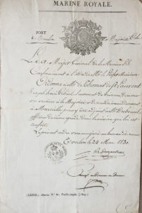 d’Alger. Ordres de service pour Joseph-Henri-Gabriel de Thomas de Saint-Laurent (1798-1836), lieutenant de vaisseau : « de cesser ses services à la Majorité, et de descendre immédiatement à Marseille pour y être adjoint à M. Dubreuil » (Toulon 24 mars) ; « d’effectuer son retour à Toulon le 12 mai 1830 » (7 mai) ; « de continuer ses services à terre à Torre Chica [Alger] auprès de Mr le Capit. de vau Bon Hugon. Cet officier comptera sur la corvette la Créole pour la solde et le traitement de table qui lui seront acquis individuellement » (Provence 28 juin) ; « de débarquer demain 1er octobre de la corvette la Créole », pour se mettre à la disposition du préfet maritime de Toulon (L’Alger 30 septembre).