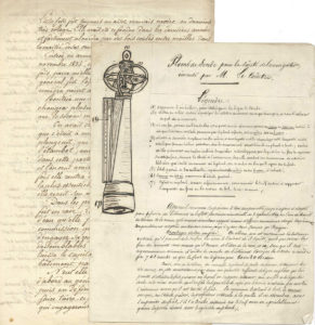 d’Espagne : on craint que « les Arabes des côtes » d’Afrique n’aient emmené l’équipage « en esclavage dans l’intérieur des terres »... – [1849]. Manuscrit d’un prospectus pour un « Plomb de sonde pour la sûreté de la navigation, inventé par M. Le Coëntre », avec beau dessin à la plume légendé, le texte vantant les mérites de l’appareil.On joint un ensemble de manuscrits et notes de l’historien Maurice Descamps (plus de 150 pages formats divers) : conférence sur La dernière course des flibustiers (1900), brouillons d’études sur l’expédition de Carthagène et sur celle Saint-Domingue, notes de lecture et de recherches sur la marine, les corsaires, etc.