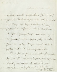 correspondance d’un pionnier de l’électrophysiologie.Matteucci évoque ses expériences d’électrophysiologie sur des grenouilles, la présentation de l’un de ses ouvrages à l’Académie des Sciences, sa candidature à une place de correspondant de l’Institut (avec liste de ses travaux), la publication d’un article en réponse aux attaques de Le Verrier, l’envoi de tiges de bismuth provenant de son galvanomètre (avec dessin), l’insertion d’une note faisant suite aux assertions erronées de l’abbé Moigno, la communication d’un manuscrit destiné aux Annales, etc. Nous en citerons deux extraits.Pise 24 décembre 1858, à Claude Bernard : « Je laisse aux physiciens de juger mes travaux de physique proprement dits. Mais personne n’est mieux que vous dans le cas de juger mes travaux d’électrophysiologie. C’est une partie de la physique qui n’existait pas et qui maintenant résulte d’expériences aussi sûres et nettes que celles de la pesanteur. Les physiciens purs ne savent pas ce que c’est de faire une bonne expérience de physique animale. Moi seul peut-être je sais ce qu’il a fallu pour prouver que le courant de la grenouille et le courant musculaire sont des phénomènes de l’organisme vivant expliqué par l’électromoteur musculaire. Nobili n’avait rien fait de cela ; au contraire, il avait faussé la nature du phénomène. Nous savons maintenant la vérité »... Turin 30 juin [1865], à un « illustre confrère » : « Je vois maintenant avec mon grand regret que les journaux Les Mondes et Cosmos ont publié un extrait de mes lettres que je leur ai adressées dans le but de répandre ma réponse et de me défendre autant que possible de l’attaque acharnée et incroyable de M. Le Verrier. Je vous prie, illustre confrère, de m’aider à répandre parmi nos confrères cette vérité et à ne pas me faire accuser de recourir à ces moyens de publication, autre que dans un cas où j’ai cru que je devais le faire pour ma défense. J’en suis très fâché et je désire que mes confrères le sachent. Du reste, M. Le Verrier peut m’accuser, je ne sais plus de quoi, que je ne répondrai plus »...