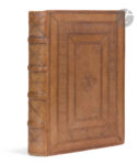 Veau fauve à l’imitation, orné sur les plats d’un encadrement à froid composé de filets et d’une large roulette à entrelac ainsi que de fers filigranés au centre, dos à nerfs orné de filets à froid s’entrecroisant (reliure moderne).