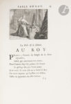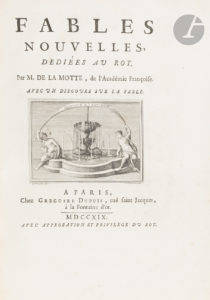 LA MOTTE (Antoine Houdar de). — Fables nouvelles, dédiées au roy. — Avec un discours sur la fable. — Paris : Grégoire Dupuis, 1719. — In-4, 281 x 209 : xlij, 358 pp., (1 f.), 1 planche.