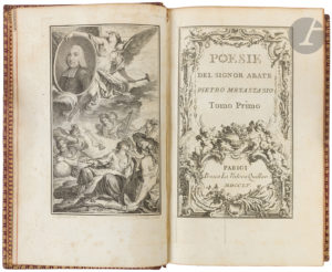 Belle édition des œuvres de Pietro Metastasio, dédiée à la marquise de Pompadour. Elle est illustrée d’un frontispice gravé par Sornique d’après Charles Eisen, d’une jolie vignette non signée en tête de l’épître, et de 12 beaux titres gravés.