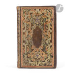Veau brun, plats ornés d’un décor d’entrelacs dorés et peints à la cire en rouge, noir, gris et violet, dos lisse orné de trois compartiments de fers croisés délimités par quatre bordures composées d’une roulette dorée entre deux bandes peintes en rouge, tranches dorées (reliure de l’époque).