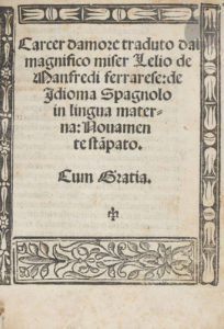 SAN PEDRO (Diego de). — Carcer damore traduto dal magnefico miser Lelio de Manfredi ferrarese : de Idioma Spagnolo in lingua materna : Novamente Stãpato. — [Venise : Giorgio de Rusconi, 19 octobre 1518]. — In-8, 145 x 97 : (48 ff.).