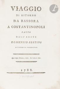 SESTINI (Domenico). — Viaggio di ritorno da Bassora a Costantinopoli fatta dall’ Abate Domenico Sestini. — [Livourne ou Yverdun], 1788. — In-4, 209 x 147 : XII, 196 pp.