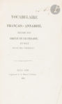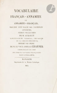 AUBARET (Gabriel). — Vocabulaire français-annamite et annamite-français, précédé d’un traité des particules annamites. — Bangkok : Imprimerie de la Mission Catholique, 1861. — In-8, 227 x 143 : (2 ff.), XCV, 96 pp., (2 ff. premier...