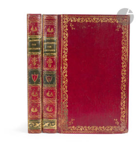 Splendide reliure strictement de l’époque, non signée mais que l’on peut attribuer à un relieur nommé P. Boyer qui utilisait le fer au navire figurant au dos (cf. Culot, Relieurs et reliures décorées en France aux époques Directoire et Empire, n° 63). Le relieur a curieusement conçu un encadrement différent pour les caissons des deux volumes, sauf pour celui du titre et celui en queue. Sur le premier volume, les motifs au centre des caissons sont entourés de deux étoiles et de quatre branches aux angles, la pièce de tomaison comprend 8 étoiles ; sur le second volume les mêmes motifs sont entourés de deux filets ondulés et de 4 étoiles, idem pour la pièce de tomaison.