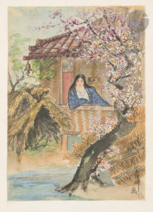 « Douces fleurs qu’effleure // Le toit de notre demeure, // Quand s’enfuira l’heure // Ou je vous vois dans mes pleurs // Ne m’oubliez pas, ô fleurs ! // Judith Gautier. » La peinture sur soie placée en regard, semble être une illustration de ce poème.