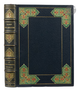 Maroquin bleu foncé, plats ornés d’un encadrement de deux filets dorés et de quatre écoinçons de maroquin vert ornés d’arabesques dorées et mosaïquées de maroquin rouge et ocre, dos à nerfs orné dans le même esprit, filets dorés en encadrement et motif doré aux angles à l’intérieur, doublures et gardes de soie moirée bleue, doubles gardes, tranches dorées sur témoins, couverture et dos conservés, étui bordé (Saulnier).