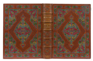 Maroquin havane, plats ornés d’un riche décor orientalisant de maroquin bleu, rouge, vert et ocre, dos à nerfs orné dans le même esprit, filets dorés intérieurs, tranches dorées sur témoins, couverture et dos conservés, étui bordé (Blanchetière-Bretault).