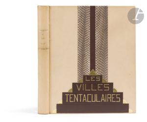 Box crème, premier plat orné au centre du bord inférieur de quatre rectangles de box marron disposés en forme de pyramide, comprenant sur les trois premiers le titre de l’ouvrage en lettres dorées, quart de pastille dorée aux extrémités de chaque rectangles, le plus haut étant surmonté d’un pyramidion doré, cette composition étant surmontée de deux larges bandes verticales de peau de serpent, allant jusqu’au bord supérieur, séparées par une bande de box marron, second plat orné dans le même esprit mais avec un rectangle de box marron en bas, dos lisse, filet doré à l’intérieur, avec sur le haut le retour des deux bandes de peau de serpent et de la bande de box marron, doubles gardes, tranches dorées sur témoins, couverture et dos conservés, étui (F. Bernard 1929).