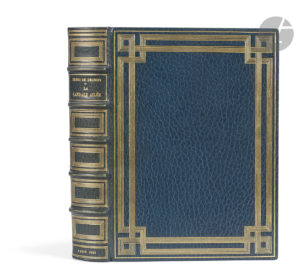 Maroquin bleu, deux séries de cinq filets dorés en encadrement sur les plats, s’entrecroisant aux angles, dos à nerfs orné de filets dorés, dix filets dorés en encadrement à l’intérieur, doublures et gardes de soie brochée, doubles gardes, tranches dorées sur témoins, couverture et dos conservés, étui bordé (H. Blanchetière).