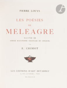 CHIMOT (Édouard) - LOUŸS (Pierre). — Les Poésies de Méléagre. — Paris : Éditions d’art Devambez, 1926. — 2 volumes in-4, (4 ff.), 171 pp., (1 f.), couverture imprimée.
