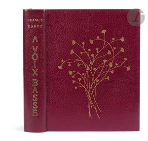 Maroquin vieux rouge, fleurs stylisées dorées et filets à froid sur les plats, dos lisse comprenant le titre en long écrit en lettres majuscules de maroquin vert bordé d’un filet doré, doublures et gardes de daim vert, tranches dorées sur témoins, couverture et dos conservés, chemise à dos et bandes à rabats de maroquin vieux rouge, étui bordé (Lucie Weil).
