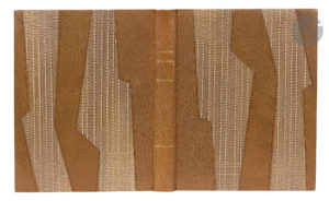 Maroquin havane, plats ornés de deux larges bandes brisées verticales de papier cuve peigné d’un treillis de lignes dans les tons bruns, dos lisse, tête dorée, non rogné, couverture et dos conservés, étui bordé (A. Lobstein).