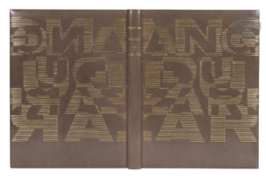 Box gris, plats ornés d’une succession de filets dorés horizontaux disposés pour former le titre de l’ouvrage, dos lisse, doublures et gardes de daim gris, tête dorée, non rogné, couverture et dos conservés, étui bordé (volume de texte) ; demi-box gris à bandes, dos lisse, étui (suites et cuivres) (M. Richard 1985).