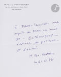 EXEMPLAIRE DU POÈTE ET ÉDITEUR PIERRE LECUIRE (1922-2013), enrichi de deux lettres autographes signées à lui adressées, l’une de Mireille Pan, la veuve de l’auteur, l’autre de sa fille Sophie Pan. Celle de Mireille est datée du 21 décembre 1978 et accompagnait l’exemplaire : « à Pierre Lecuire sans lequel ce livre ne serait pas ». La seconde est datée du 9 avril 1979 et porte sur l’exposition en hommage à Imre Pan qui s’est déroulée à la galerie des éditions de l’ermitage à partir du 2 mars 1979 : « J’ai lu le texte que avez (sic) écrit pour mon livre d’or et j’en suis très touchée […] Cela sera pour moi un très beau souvenir de cette exposition, de mon père et de ses amis qui ont aidé le livre à paraître. Je suis heureuse que l’on ait pu rendre à mon père un si bel hommage. »