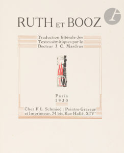 SCHMIED (François-Louis) - MARDRUS (Jean Charles). — Ruth et Booz. — Traduction littérale des Textes sémitiques par le Docteur J. C. Mardrus. — Paris : F. L. Schmied, 1930. — In-4, 355 x 285 : (38 ff. 3 premiers et 2 derniers blancs),...
