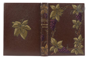 Maroquin brun, raisins et feuilles de vignes mosaïqués en encadrement sur le premier plat, feuilles de vigne mosaïquées au centre du second plat, dos lisse orné de raisins et de feuilles de vigne mosaïqués, encadrement de maroquin brun à l’intérieur, orné d’un listel de maroquin olive entre deux filets noirs, coupé aux angles d’un carré en maroquin olive, aux bords incurvés et orné au centre d’une rose en maroquin rouge, doublures et gardes de soie brochée, doubles gardes, tranches dorées sur témoins, couverture et dos conservés, chemise à dos et bandes à rabats de maroquin brun, étui bordé (Charles Lanoé).