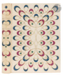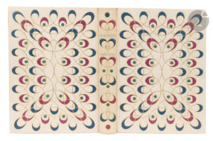 Maroquin ivoire, plats ornés d’un riche décor de boucles dorées entrelacées et mosaïquées de maroquins rouge et bleu foncé, entourant plusieurs pastilles de maroquin vert foncé, dos lisse orné dans le même esprit, doublures bord à bord et gardes de box vert, tranches dorées sur témoins, couverture et dos conservés, chemise à dos à bandes à rabats de maroquin bleu foncé, étui bordé (Georges Cretté).