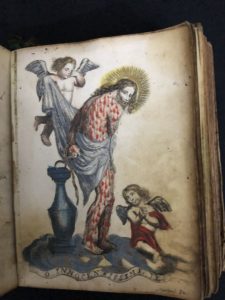 [MANUSCRIT]. — [GRAVURE].— [DÉVOTION]. — [Italie, XVIIIe siècle]. — Touchant témoignage de piété, très probablement réalisé en Italie au XVIIIe siècle. — C'est un volume de 12 x 9 x 3,5 cm., reliure en maroquin grenat, dos à 5...